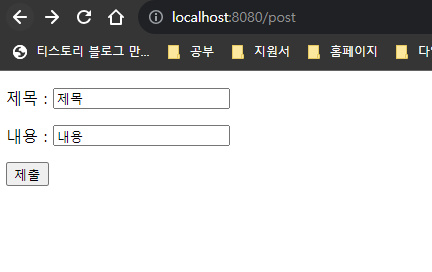 localhost:8080/post 주소를 입력하면 데이터를 입력받기 위한 창이 보여진다.