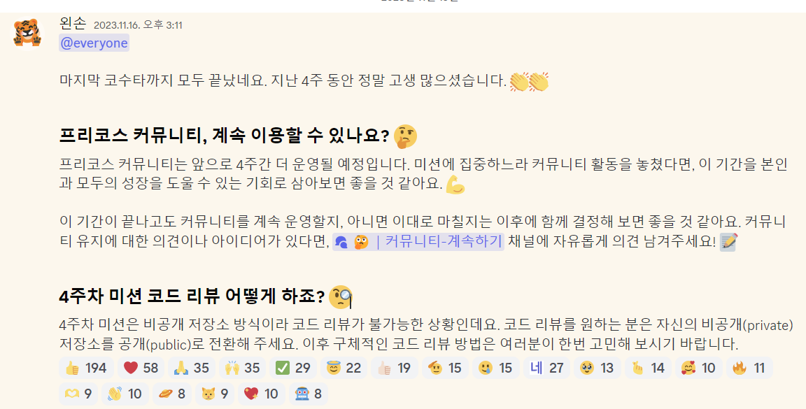 우리가 우테코에 참여하기를 희망하는 것에는 다양한 이유가 있겠지만, 그 중 "열정의 온도가 비슷한 사람들 속에서 함께 학습하고 싶다!" 라는 이유도 작지 않을 것이라 생각하는데요. 커뮤니티에서 활동하며 열정적으로 프리코스를 마무리 하신 모든 분들이 엄청난 열정을 가지고 계신 분들이 아닐까 라는 생각을 하게 되었습니다.